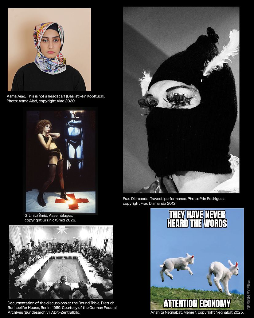 Ausgehend von der künstlerischen Arbeit „Das hier ist kein Kopftuch“ von Asma Aiad im Rahmen der Ausstellung bringt dieser Abend künstlerische Arbeiten muslimischer Künstler*innen zusammen, die sich mit Fragen von Sichtbarkeit, Repräsentation und ästhetischer Teilhabe auseinandersetzen. Die präsentierten Arbeiten fungieren nicht als Illustrationen gesellschaftlicher Debatten, sondern als eigenständige ästhetische und politische Positionen.